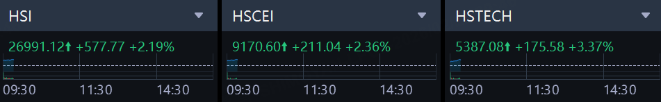 The Hang Seng Index rose by 2.19%, the Hang Seng China Enterprises Index increased by 2.36%, the Hang Seng Tech Index climbed by 3.37%.