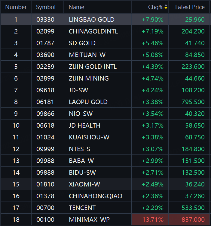 Lingbao Gold up 8%; China Gold up over 7%; SD Gold, Meituan up over 5%; Zijin Gold, Zijin Mining, JD up over 4%; Alibaba up 3%; Baidu, Xiaomi, Tencent up over 2%; MiniMax tumbles 14%.