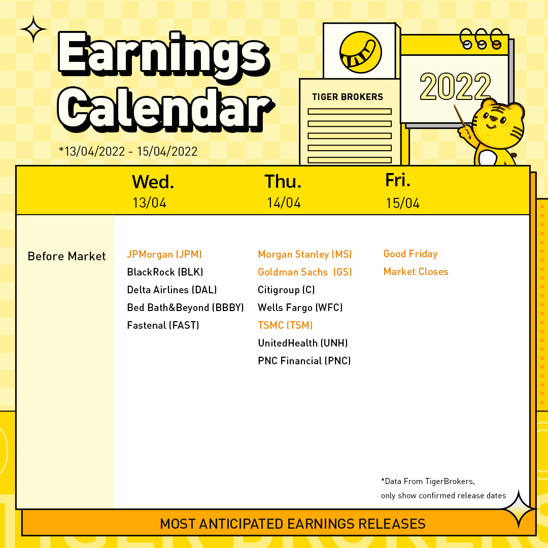 First-quarter resultsare expected from several banks and financial-services companies including Wells Fargo, U.S. Bancorp, Goldman Sachs, Morgan Stanley, Citigroup, PNC Financial Services Group, State Street, and Ally Financial. Others companies reporting financial results include Rite Aid, Taiwan Semiconductor Manufacturing, and UnitedHealth Group.