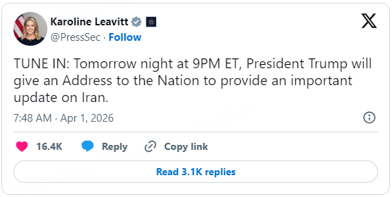 President Donald Trump will deliver a speech on Wednesday at 9 p.m. Washington time to give an update about the war in Iran, White House Press Secretary Karoline Leavitt said.