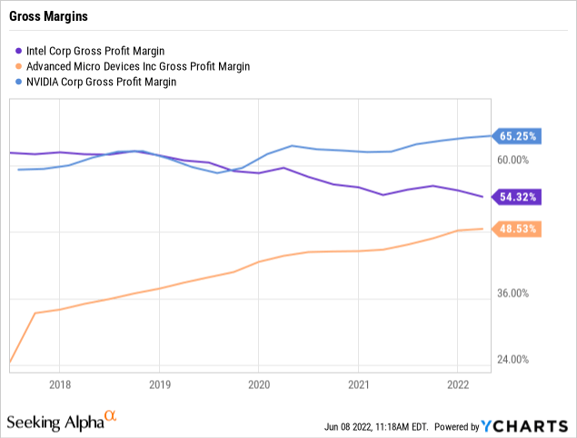 Intel only guided to gross margins of 51% for Q2'22 and 52% for the year. At these low gross margins, any further pressure very much pressures profits to once unexpected levels for a company once dominating the market with gross margins far above 60%.