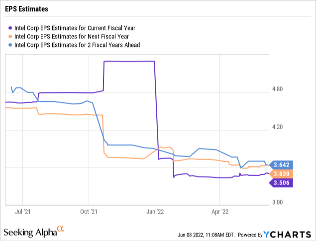In essence, Intel guided to a slight increase in revenues with EPS plunging to just $3.60. The company actually said numbers are worse than those expectations when guiding back in April. The consensus estimates had the 2022 EPS down at $3.51 rising to $3.63 in 2023 for the trough. In reality, the numbers for the next 3 years are virtually flat around $3.50 to $3.60 per share.
