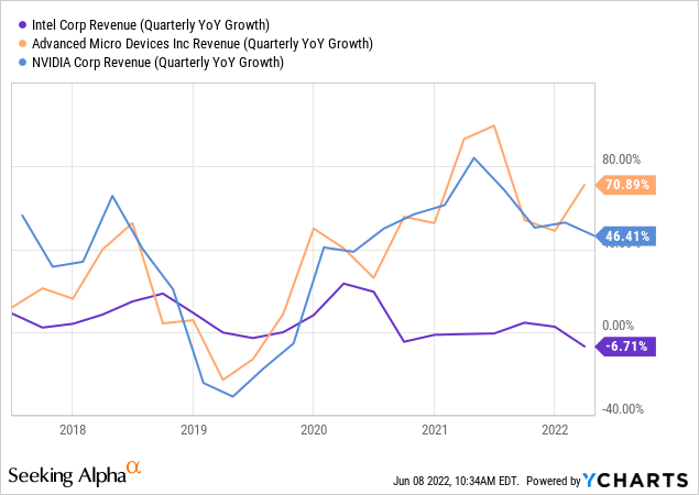 The problem ailing Intel is the last few years is actual growth in the business while chip competitors are reporting booming growth. In most cases, AMD(AMD) and NVIDIA(NVDA) lacked the chip supplies to meet demand due to fast growth. The indication here was that the chip giant would ultimately give up more market share leads once the competitors sourced more supplies from foundries like TSMC(TSM).