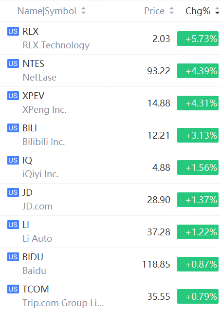 NetEase, XPeng rose over 4%; Bilibili rose over 3%; iQiyi, JD.com, Li Auto rose over 1%.
