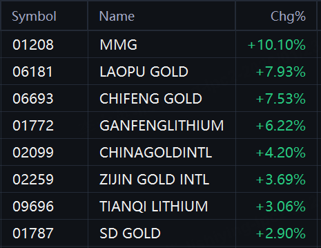 Recious metal and non-ferrous metal stocks jumped in Hong Kong. MMG rose 10%; Laopu Gold and Chifeng Gold rose 8%; Ganfeng Lithium rose 6%; China Gold International Resources and Zijin Gold International rose 4%; Tianqi Lithium and SD Gold rose 3%.