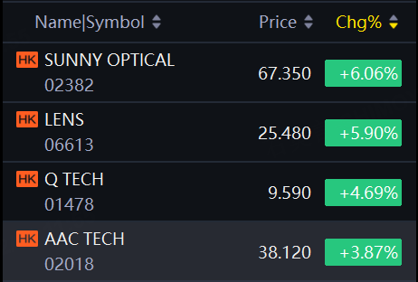 Apple concept shares rose in Hong Kong. Sunny Optical, Lens up about 6%; Q Tech up over 4%; AAC Tech up over 3%.