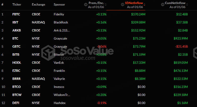Yesterday the net inflow of the US Bitcoin spot ETF was $987.06M. The highest net inflow on Jan 6 was Fidelity Wise Origin Bitcoin Fund , with a net inflow of $370.24 million. Following that was iShares Bitcoin Trust , with a net inflow of 209.08 million, according to SoSoValue.