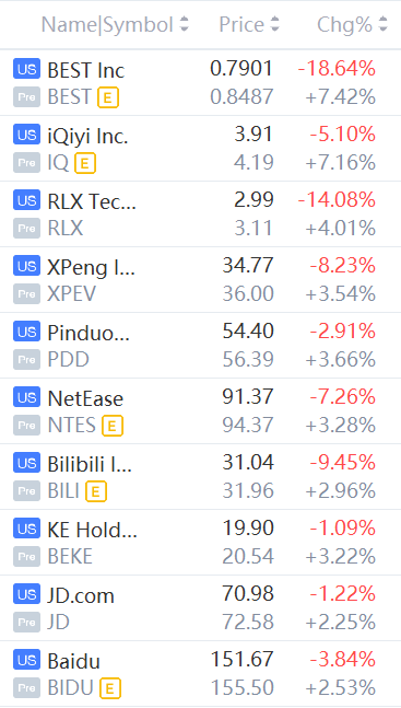 iQiyi, Pinduoduo, Bilibili, Xpeng, Best Group, NetEase and JD.com rose between 2% and 8%.