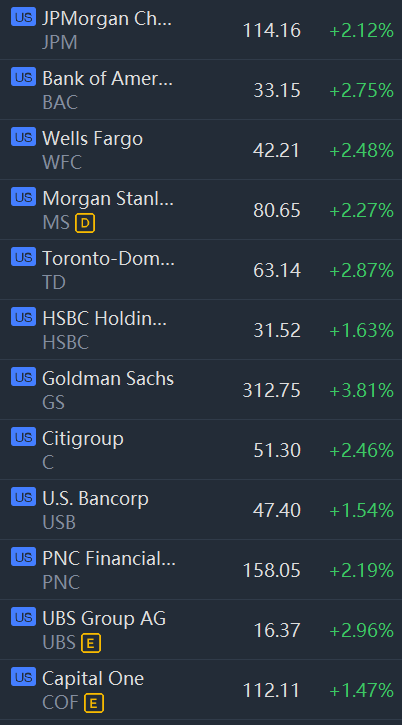 Bank stocks jumped in morning trading. JPMorgan Chase, Bank of America, Wells Fargo, Morgan Stanley, Goldman Sachs and Citigroup all climbed more than 2%.