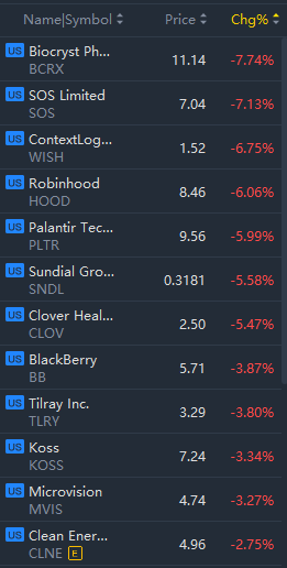 Meme stocks declined in morning trading, with WISH falling nearly 7% and Palantir falling over 5%.