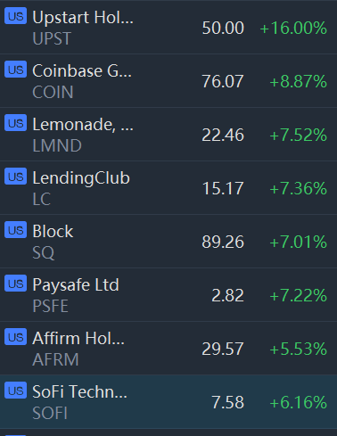 Fintech stocks surged in early trading. Upstart, Coinbase, Lemonade, Lending Club, Block, Paysafe, Affirm and SoFi climbed between 6% and 16%.