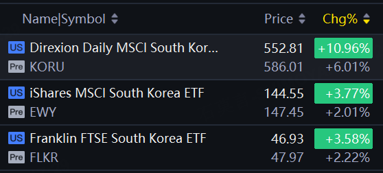 Direxion Daily MSCI South Korea Bull 3x Shares soars 6%; iShares MSCI Korea ETF up 2%.
