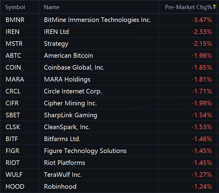 Crypto stocks fell in premarket trading. BitMine fell 4%; IREN, Strategy, Cipher Mining, American Bitcoin, Coinbase, MARA Holdings, SharpLink Gaming, CleanSpark, and Riot Platforms fell 2%; Robinhood fell 1%.
