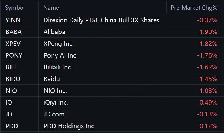 Chinese ADRs dropped in premarket trading. Alibaba, XPeng, Pony AI, Bilibili, and Baidu fell 2%; NIO fell 1%.