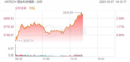 恒生科技指数午后涨超3%,京东健康涨超8%领涨成分股,中芯国际涨超6%,东方甄选、小鹏汽车-W涨超5%
