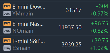 At 07:45 a.m. ET, Dow e-minis were up 304 points, or 0.97%, S&P 500 e-minis were up 39.75 points, or 1.02%, and Nasdaq 100 e-minis were up 96.75 points, or 0.82%.