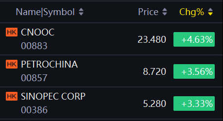 China's three oil majors rose in Hong Kong. CNOOC up over 4%; PetroChina, Sinopec up over 3%.