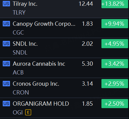 Cannabis Stocks Shined. Tilray up 14%; Canopy Growth up 10%; SNDL up 5%; Aurora Cannabis and Cronos up 3%; OGI up 2%.