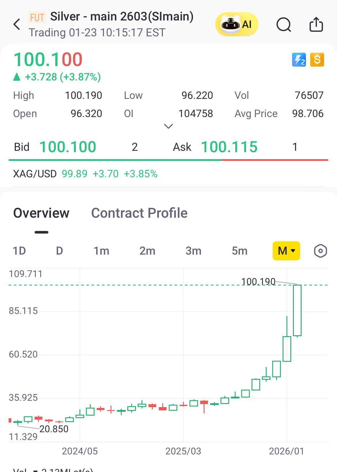 Silver Futures Break Through the Critical $100 Per Ounce Mark, Last up 3.85%