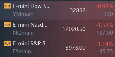 At 8:35 a.m. ET, Dow e-minis were down 330 points, or 0.99%, S&P 500 e-minis were down 45.75 points, or 1.14%, and Nasdaq 100 e-minis were down 187 points, or 1.53%.