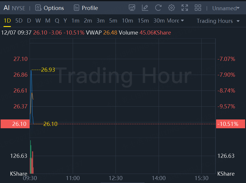 The shares dropped to a low of $26.05 in extended trading after closing at $29.16 in New York. C3.ai, whose ticker is literally “AI,” gained 161% this year as Wall Street developed an insatiable appetite for the emerging technology.