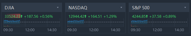 U.S. stocks cheered up in morning trading. Nasdaq surged 1.29%; S&P500 jumped 0.89% while Dow Jones rose 0.56%.