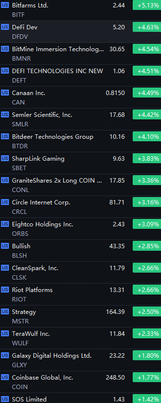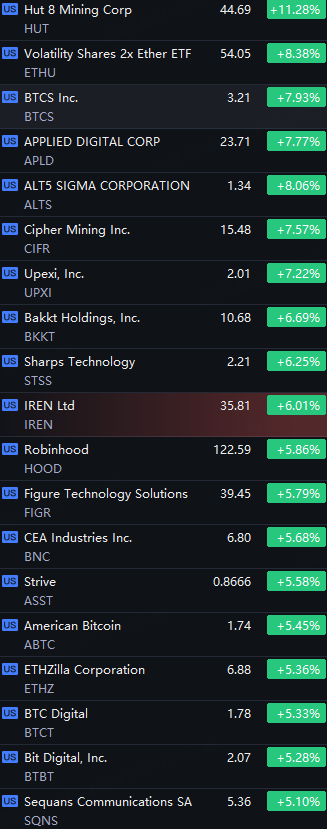 Crypto Shares Rally. Hut 8 Up 11%; Applied Digital, BTCS, ALT5 Up 8%; Robinhood Up 6%; Circle and Strategy Up 3%