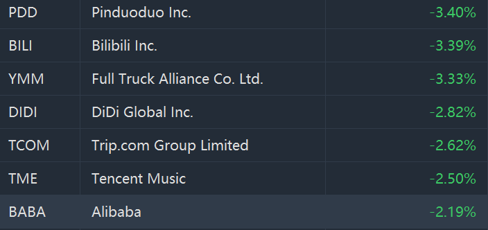 Alibaba, Pinduoduo, Bilibili, Didi and Tencent Music fell between 2% and 4%.