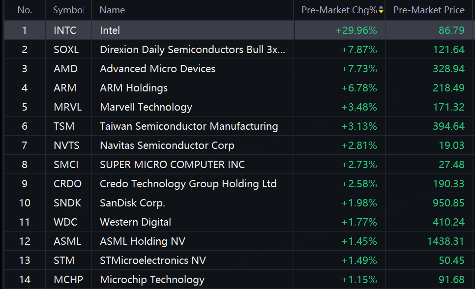 Semiconductor shares rose after Intel's earnings report. Intel up 30%; SOXL, AMD up nearly 8%; Arm up about 7%; Marvell, TSMC, Navitas, SMCI up around 3%.