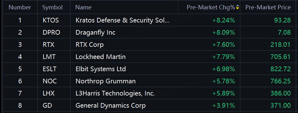 Saturday's strikes on Iran by the U.S. and Israel will likely shine an even bigger spotlight on defense stocks and drone makers. Kratos Defense, Draganfly up over 8%; RTX, Lockheed Martin up nearly 8%.