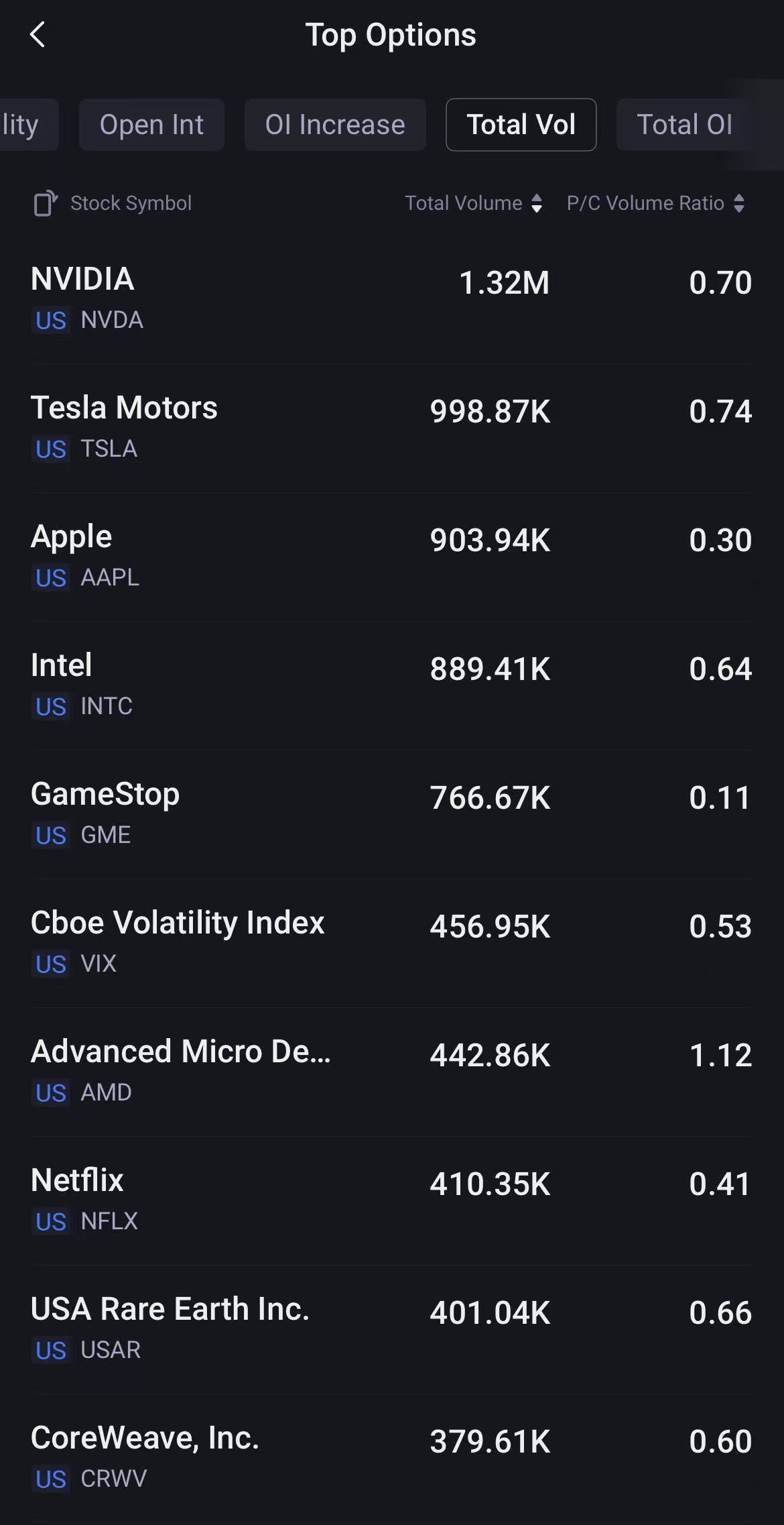 Top 10: NVIDIA, Tesla Motors, Apple, Intel, GameStop, Cboe Volatility Index, Advanced Micro Devices, Netflix, USA Rare Earth Inc., CoreWeave, Inc.
