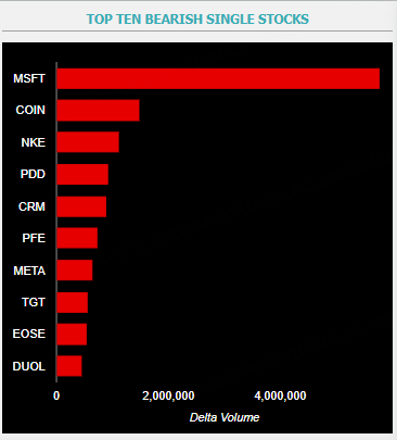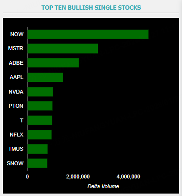This report shows stocks with the highest volume of bullish and bearish activity by option delta volume, which converts option volume to an equivalent stock volume (bought or sold).