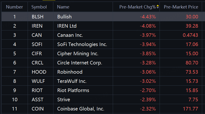 Crypto shares fell in premarket trading. Bullish, IREN, Canaan fell around 4%.