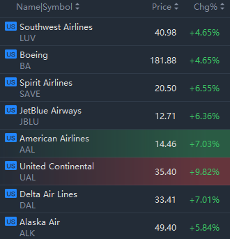 US airline and cruise shares jumped in morning trading. Southwest Airlines,Delta Air,United Airlines and American airlines rose from 4% to 9%.
