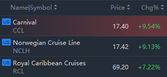 Shares of cruise operators Norwegian Cruise Line, Carnival Corp and Royal Caribbean Cruises Ltd rose from 7% to 9%.
