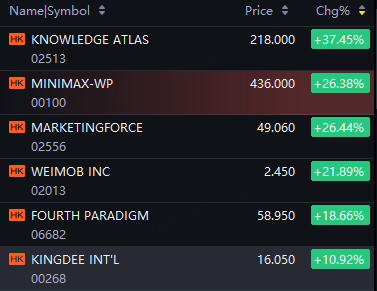 Knowledge Atlas up 37%; Marketingforce, MiniMax up 26%; Weimob up 22%; Fourth Paradigm up 19%; Kingdee Int’l up 11%.