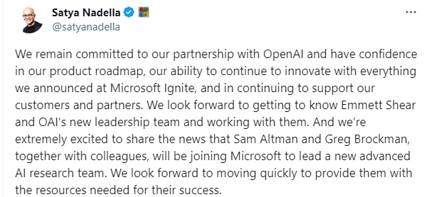 Nadella confirmed that Altman and Brockman will be joined by their former OpenAI colleagues at Microsoft's new AI team.