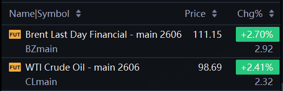 Brent oil futures jumped 2.7% to $111.15 a barrel; WTI crude oil futures rose 2.41% to $98.69 a barrel.