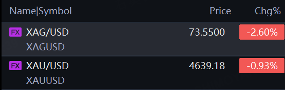 Spot silver fell 2.6% to $73.55 per ounce; spot gold fell 0.93% to 4,639.18 per ounce.