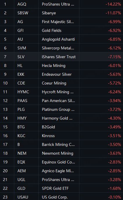 Precious Metals Shares Slide. AGQ Down 14%; Sibanye Down 11%; AG, AU, SLV and Gold Fields Down 7%; Silvercorp, Hycroft and Endeavour Silver Down 6%.
