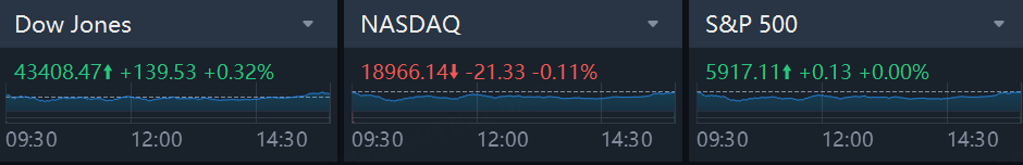 The Dow Jones Industrial Average rose 139.53 points, or 0.32%, to 43,408.47, the S&P 500 gained 0.13 points, or 0.00%, to 5,917.11 and the Nasdaq Composite lost 21.32 points, or 0.11%, to 18,966.14.