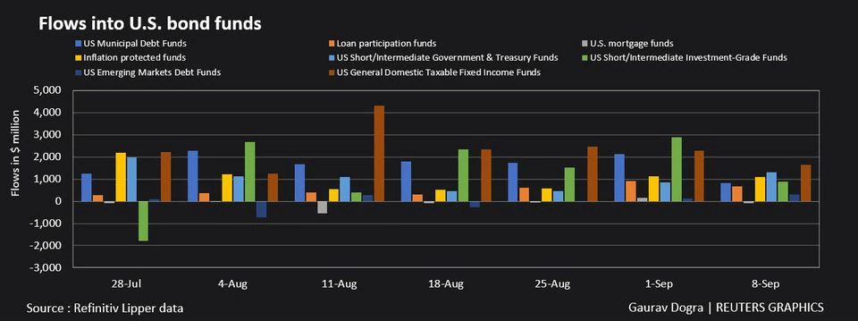 U.S. inflation-protected funds pulled in a net $1.1 billion, marking a seventh week of inflows, while short/intermediate government and treasury funds received a net $1.3 billion, a 53% increase over the previous week.