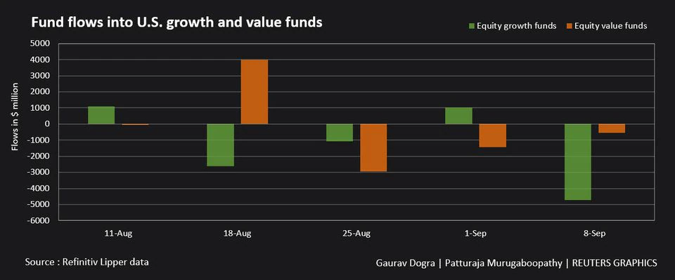 U.S. equity growth funds faced net selling of $4.72 billion, their biggest outflow in seven weeks, while value funds saw outflows for a third straight week, worth a net $541 million.