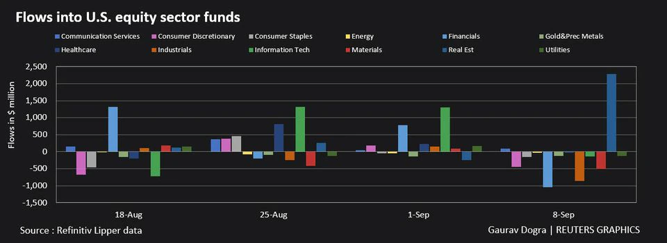 Among equity sector funds, real estate funds lured a net $2.29 billion, the biggest since at least mid-October 2019. However, financials, industrials and materials sectors faced outflows of $1.05 billion, $857 million and $512 million respectively.
