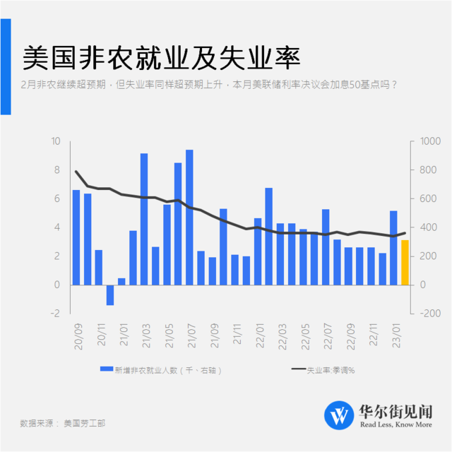 2月非农新增就业人数31.1万人,大幅超过预期的22.5万人,前值为51.7万人(修正值为50.4万人)。2月失业率为3.6%,略高于预期和前值的3.4%。