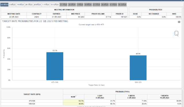 投资者可能认为,这一报告将使美联储在2月加息25基点,而非市场此前多数预期的50基点。芝商所美联储观察工具(CME FedWatch)显示,美联储3月加息50基点的可能性为47%,较稍早前的80%大幅下降。