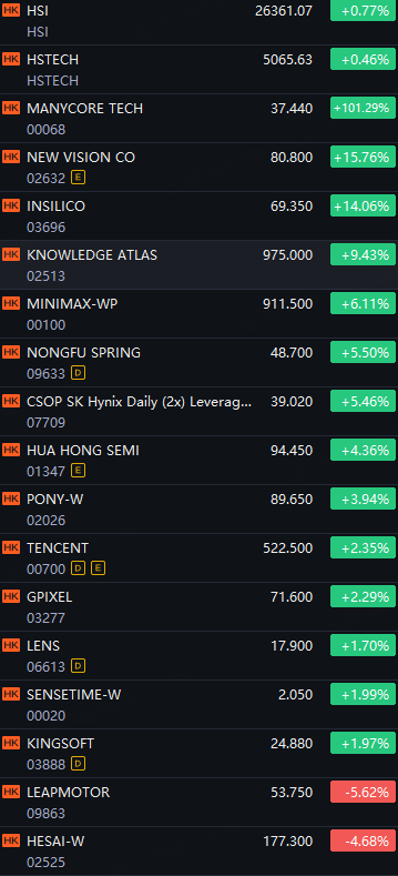 MANYCORE TECH surged 101%; New Vision up 16%; Insilico up 14%; Knowledge Atlas up 9%; MiniMax up 6%; Tencent rose 2%; LEAPMOTOR fell 6%.