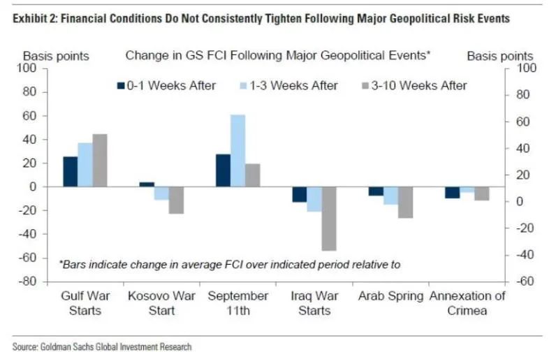 虽然地缘政治事件对通胀和经济增长肯定是负面的,但金融环境紧缩带来的影响是最不可预测的。数据显示,过去的地缘政治风险事件之后,美国金融状况很少出现有实质性的紧缩,尽管很难概括到目前的情况。