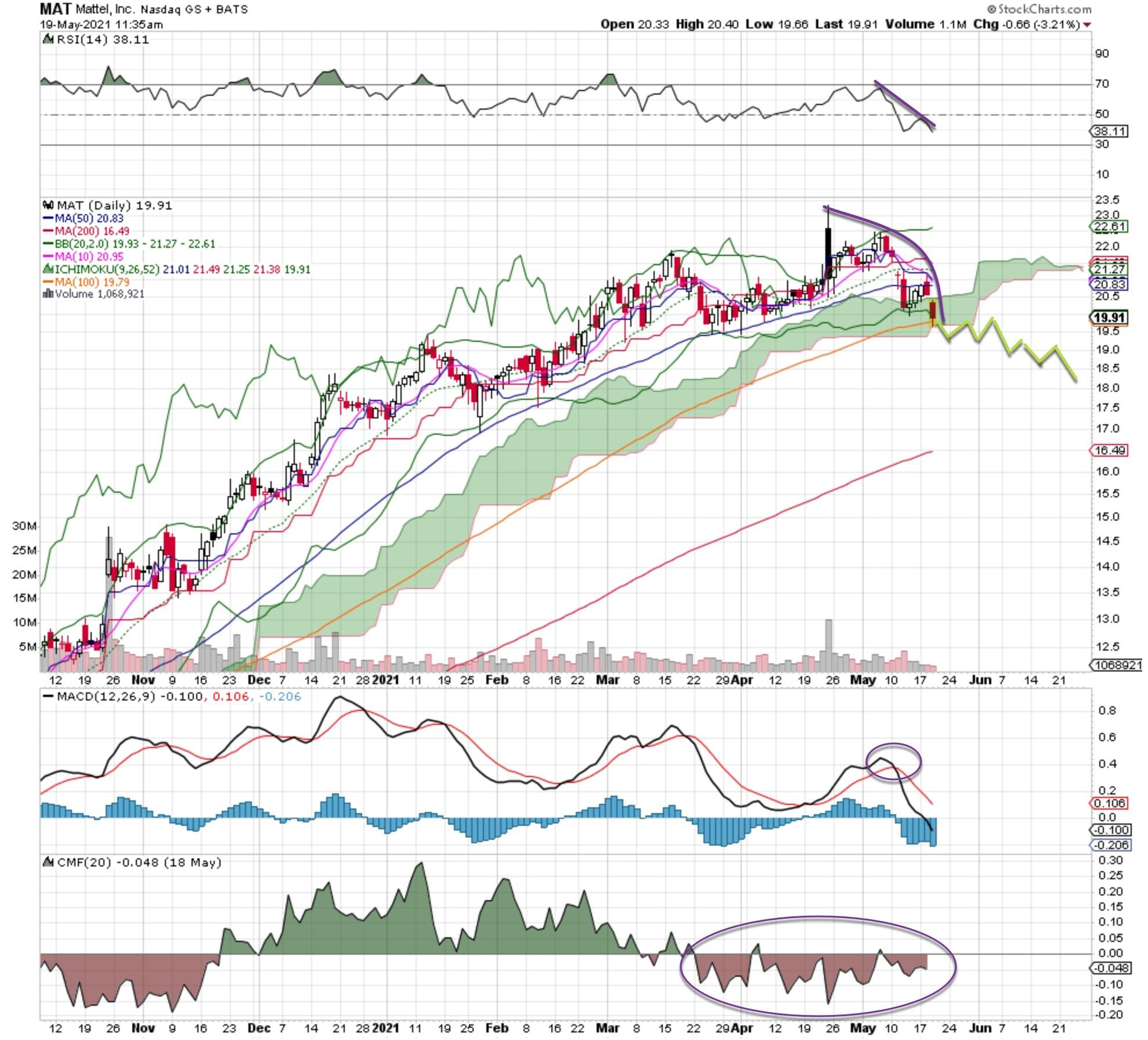 The toymaker's chart shows the stock has started to roll over and eventually will make a run to its 200-day moving average. Last week saw Mattel stop at the 100-day moving average, but all the indicators have turned bearish.