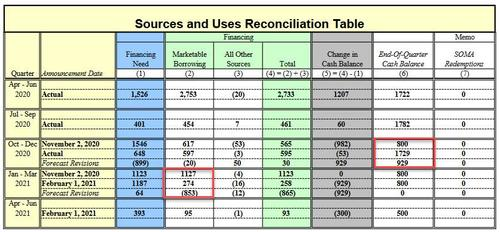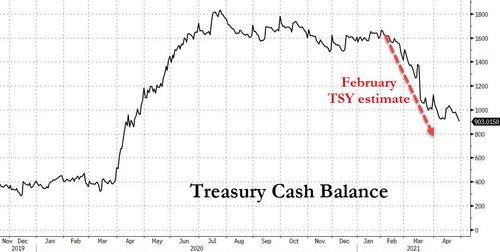 Three months ago, theTreasury surprised marketswhen in itsquarterly borrowing forecast, it revealed that in the first calendar quarter of 2021, it wouldn't need to borrow as much debt as it had recently because the Treasury's cash balance (held in the Treasury General Account, or TGA, which is simply the Treasury's cash balance held at the Fed) would plunge to just $800 billion, down a record $929BN from $1.729 trillion at Dec 31, 2020.